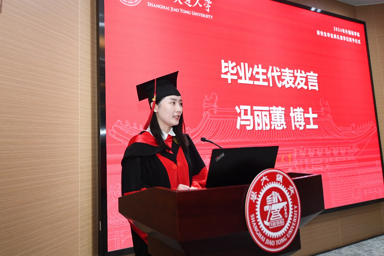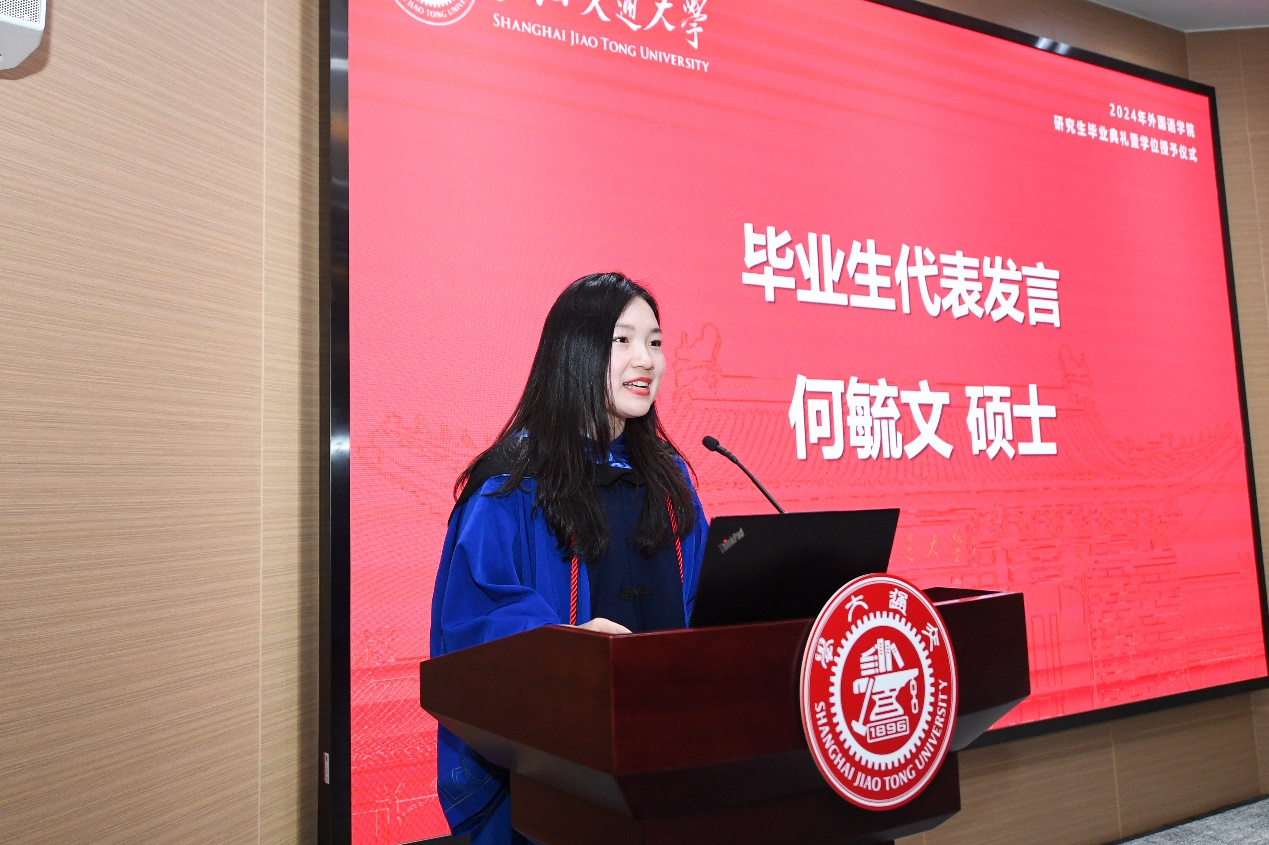 优秀硕士毕业生代表何毓文走上选调生道路,她回顾了三年来在交大学习生活的点滴,表达了对学院、老师们深深感激,并号召同学们在新的岗位上肩负起时代赋予的责任与使命。
