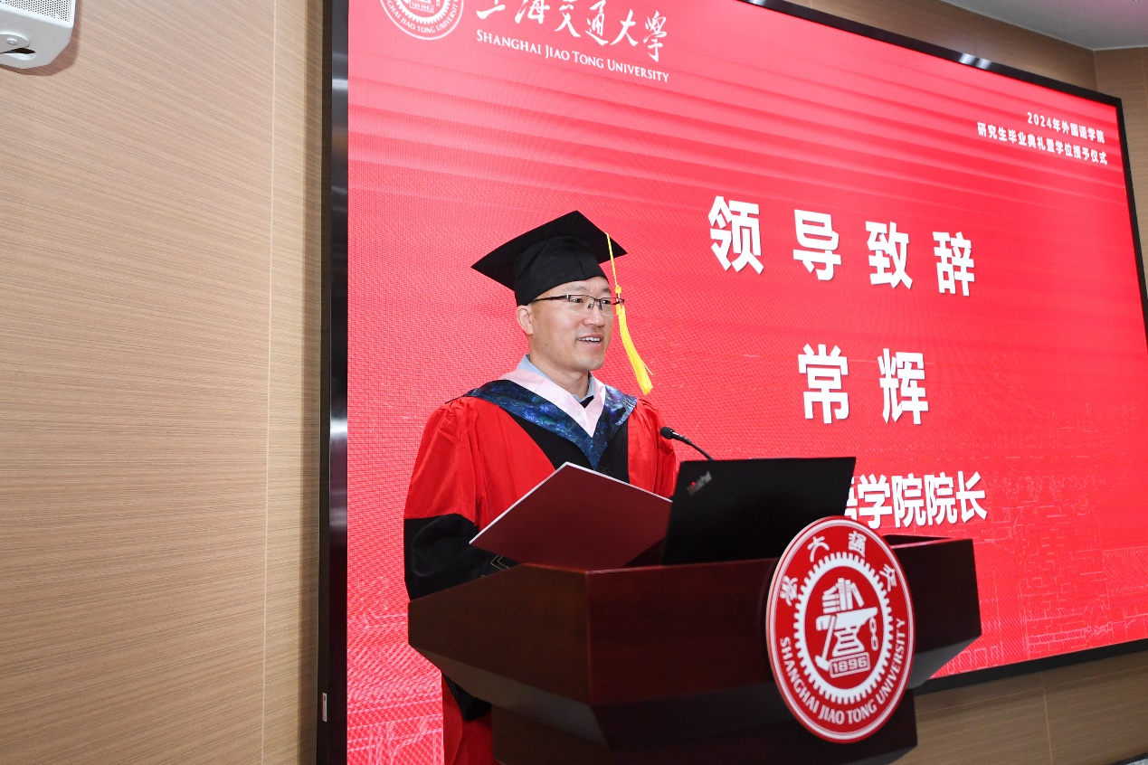 常辉代表学院向毕业生致辞,回顾了三年来毕业生和学院一起经历的考验和难忘的瞬间,并寄语全体毕业生:终生学习的能力与习惯是学校赠予毕业生最珍贵的法宝,为人生觅真理是不变的底气;坚持问题导向,从理论体系构建、成果转化、社会服务等多方面为健康中国战略践行外语人的强国担当;常以赤诚的心灵关注世界,常以语言的力量感同身受,构建起以和为贵、美美与共的中国话语体系,在人类命运共同体的建设中彰显新时代外语青年的日月胸襟。最后,他向毕业生们送上祝福,期待大家在各行各业中发挥本领,彰显外语人的风采。