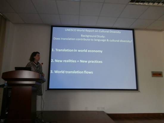 5月28日下午,Annie Brisset教授以“翻译与文化多样性:世界翻译流通与实践回顾”为题,深入剖析了联合国教科文组织世界文化多样性报告,以翔实的事实和数字揭示了翻译在全球化进程中所扮演的至关重要角色,指出社会变化对翻译活动和流通的影响。在全球化的当今世界,翻译一方面促进了语言与文化多样性,另一方面又不断加强了英语的强势地位,削弱了语言与文化多样性。在世界范围内,译自英语的文献占据压倒性优势,译自汉语的文献寥寥无几。因此,中国亟需从国家战略层面大力推进中国文化对外翻译与传播。