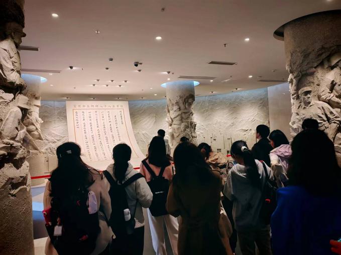 4月14日上午,培训班前往四行仓库抗战纪念馆进行研学实践。四行仓库承载着中国人民英勇抗战的珍贵史实。1937年,中国军队第88师262旅524团中校团附谢晋元临危受命,率领所部420余名官兵(外界敬之为"八百壮士”),坚守四行仓库抗击侵华日军,激战四天四夜。学员们认真观摩谢晋元营长的辞别家书、还原战斗场景的人物塑像、四行激战的历史遗物,感受八百壮士战斗事迹之英勇,爱国气节之豪壮。