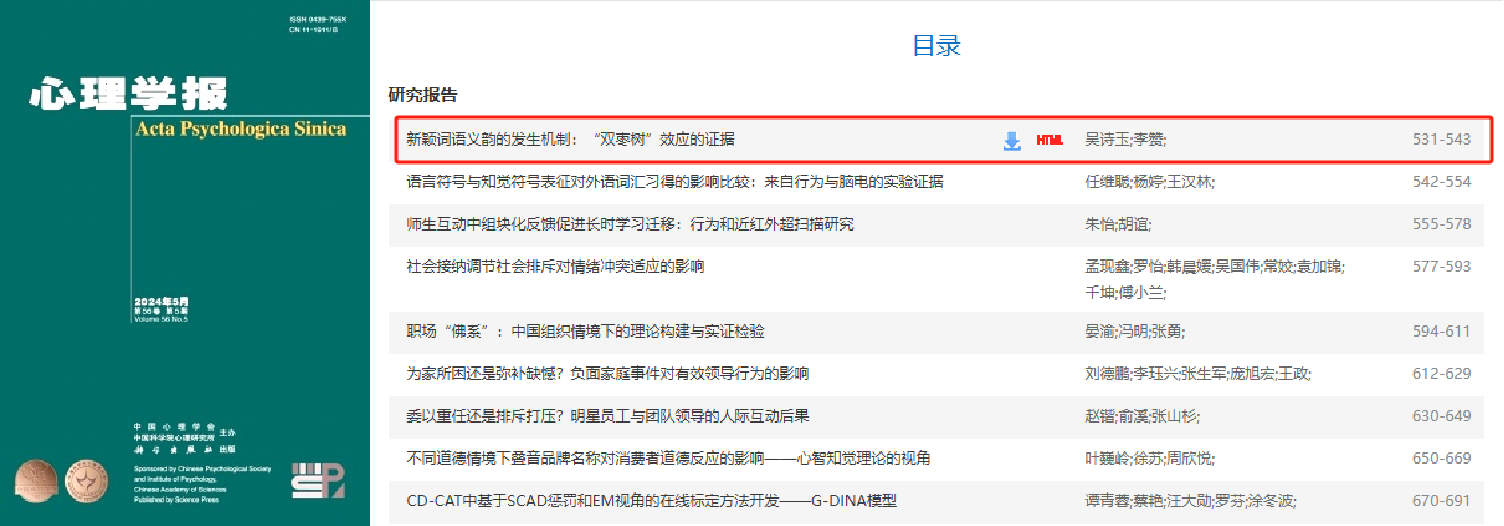 这项最新的研究成果已经发表在中文顶尖期刊《心理学报》上(《新颖词语义韵的发生机制:“双枣树”效应的证据》, 2024年第5期),除了探讨语境情感的传递机制,这项研究还探讨了这种传递对单词词形及词义习得的效果。