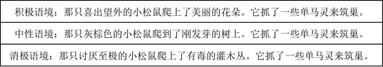 尽管被试要学习的9个目标词(新颖词)起初并没有任何语义,但是在嵌入到阅读的语篇之后通过语境而获得语义,被试需要通过阅读推测出并学会它们的语义,同时记住它们的词形。如下图1,出现在不同语境情感的新颖词“单马灵”表达的是“一种植物”。