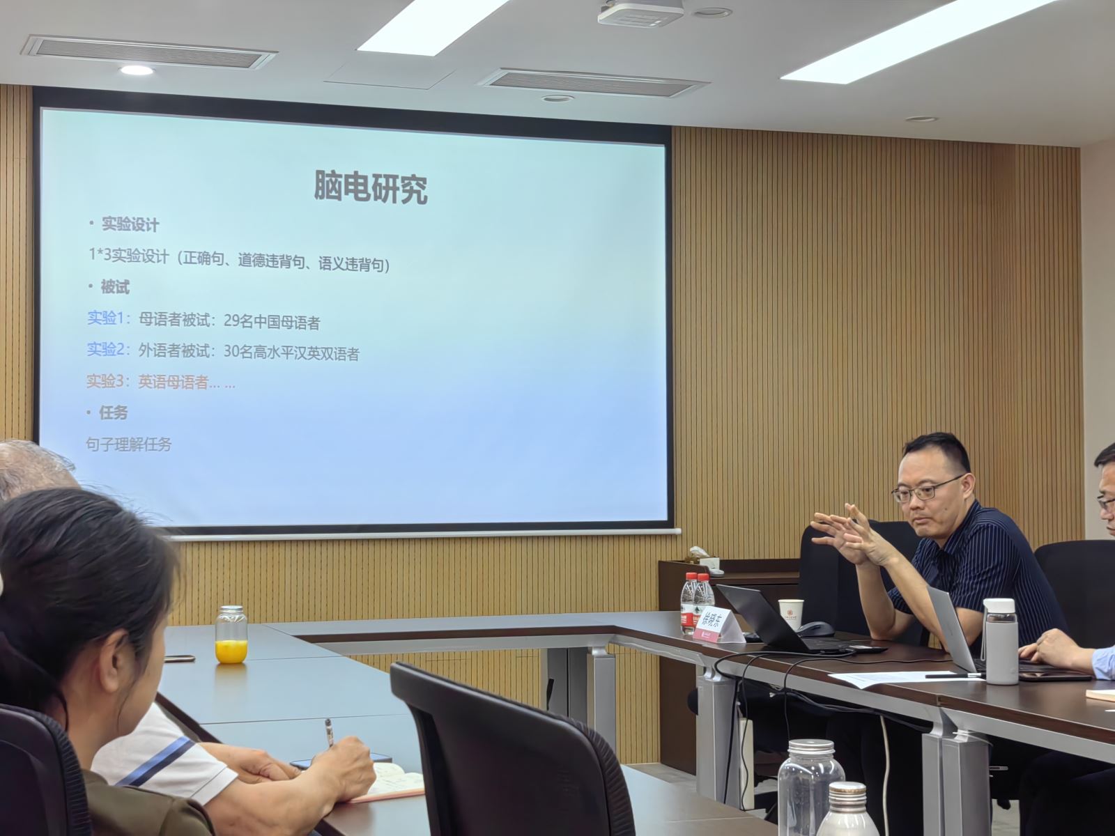 在提问和讨论环节,多位老师和同学积极就讲座内容提出疑问和建议,徐晓东教授一一做出回应。袁博平教授基于双语者在生活中会有意进行语码转换这一现象,提出人们使用外语思考或行动时并不一定更理性,而是有着非常复杂的心理原因。比如,使用外语回避母语文化禁忌,从而减轻说话者或行为者的心理负担。袁博平教授还建议,后续研究在编写实验材料和选择实验对象时应控制好宗教、年龄和职业等因素对实验结果的影响。丁红卫教授则对ERP经典成分P600在不同语种的实验中应如何解释提出了疑问,徐晓东教授结合自己过往研究指出,应结合研究语料、语言和操纵变量来对P600成分加以合理解释。丁红卫教授还结合本研究结果提出了自己的教学思考:如果用外语交流能入脑,用母语才能入心,那么,对我国外语专业的同学进行专业授课时,教师使用母语还是外语更好?此外,徐旴、王海燕、李菲、徐俪珑、赵晴雯等老师和同学就实验设计、呈现方式、实验材料和数据处理等方面与徐晓东教授进行了深入探讨。