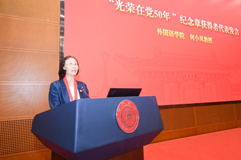 五十载峥嵘岁月,五十载初心如磐。他们不忘入党初心,永葆党员本色,对党忠诚,不辱使命,勤勉敬业,务实尽责,为广大党员作出了表率。何小凤教授作为获颁“光荣在党50年”纪念章的老党员代表发言,深情回顾入党50年来的峥嵘岁月,表达了对党的无限忠诚和对学校事业发展的热爱。