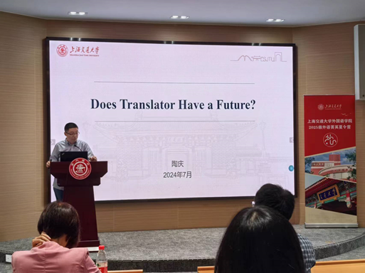 陶庆以“Does Translator Have a Future?”为题阐述了翻译方向的历史与现实,指出交大外院的翻译专业以其鲜明的跨学科特色而独树一帜,不仅紧密结合了认知科学、人工智能等前沿领域,还充分运用语料库等先进技术,为翻译教育与实践注入创新活力。
