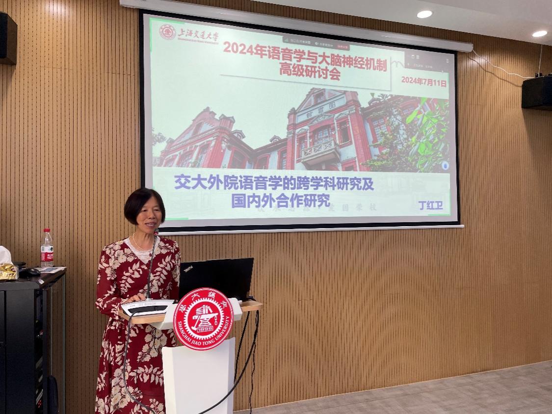 丁红卫教授作题为“交大外院语音学的跨学科研究及国内外合作研究简介”的主题报告,介绍交大外院跨学科特色,概述团队研究的总体框架及和各方院校单位的合作研究,强调团队目前对语言与健康的大脑神经机制的特别关注和工作成果。