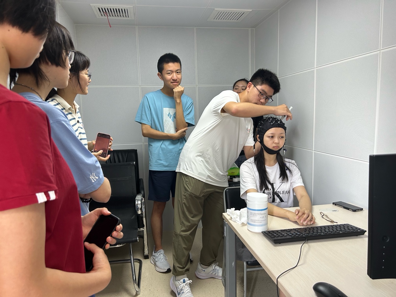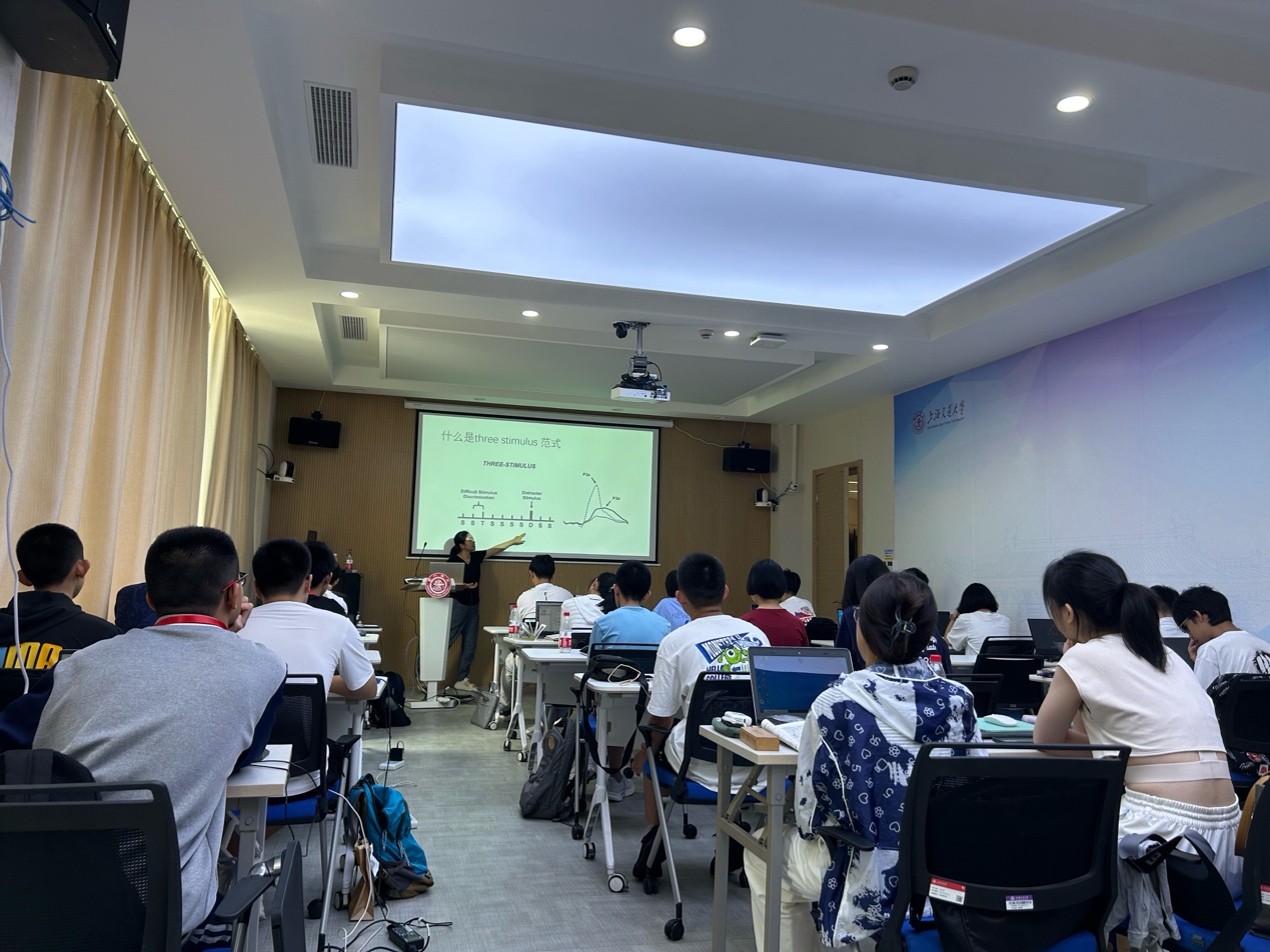 7月18日上午,开元网页版副教授李菲带来脑电课程,课程内容丰富新颖,激发了学员的兴趣和热情。通过课堂讲解、视频学习和现场实操,学员们充分了解了脑电实验的原理,电极帽的分类及作用,脑电实验开始前的硬件、软件准备工作,实验过程中可能遇到的问题及处理方式,以及实验数据的后期筛选及处理等相关知识。学员们分组参观开元网页版脑电实验室,并观摩脑电实验全过程。李菲就学员提问进行了现场答疑,使学员们对语言和大脑的关系有更深入的理解。