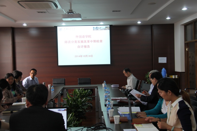 10日16下午,我院师资分类发展改革中期检查报告在杨咏曼楼召开。上海交通大学副校长吴旦、副校长张安胜、人力资源处副处长赵震以及规划处、文科处的领导与会参加。学院领导班子成员以及骨干教师代表参加了此次报告会。院长胡开宝教授作自评报告。