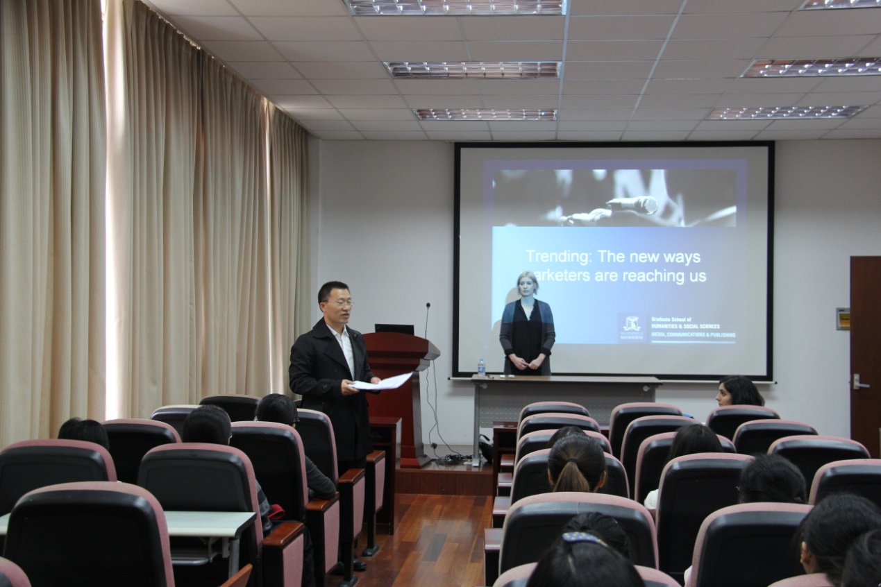 下午1点,墨尔本大学客人在学院111教室举行了本科2+2双学位项目宣讲。常辉副教授首先介绍了来访的客人,并希望同学们能从宣讲中获取有用的信息。随后,Beckett博士为学生做了一场题为“Trending: The new ways marketers are reaching us”的报告,运用大量生动有趣的例子,介绍了当前传媒的新发展;Amber Perry女士就墨尔本大学文学院与我院合作项目的细节,如可选专业、学费、住宿等问题作了详细的介绍,并与在场的同学进行了深入交流。