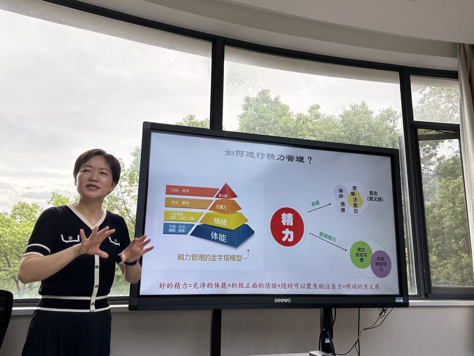 汪国琴围绕《精力管理》的核心理念,分享了精力管理的金字塔模型、评估自己目前的精力管理现状,阐述了如何科学合理地管理个人精力,从而提升工作与生活的质量。并带大家练习快速放松身心、平复情绪、恢复精力、提升元气的自助技巧,帮助大家有意识地培养精力管理的微习惯和仪式化行为,更好地减压赋能。她指出,在当今快节奏的社会环境中,有效地管理个人精力对于维持身心健康至关重要。