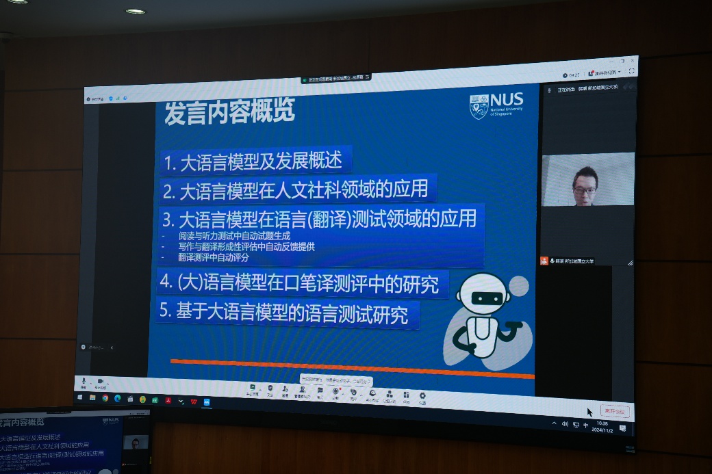 新加坡国立大学韩潮教授则聚焦“大语言模型在语言(翻译)测评中的应用:研究热点与进展”,深度剖析了大语言模型在试题生成、自动评分和学习反馈等方面的应用,并指出了推动语言测评研究的关键要素,为应用语言学研究带来了全新视角。因台风影响,韩教授进行了线上主旨发言。