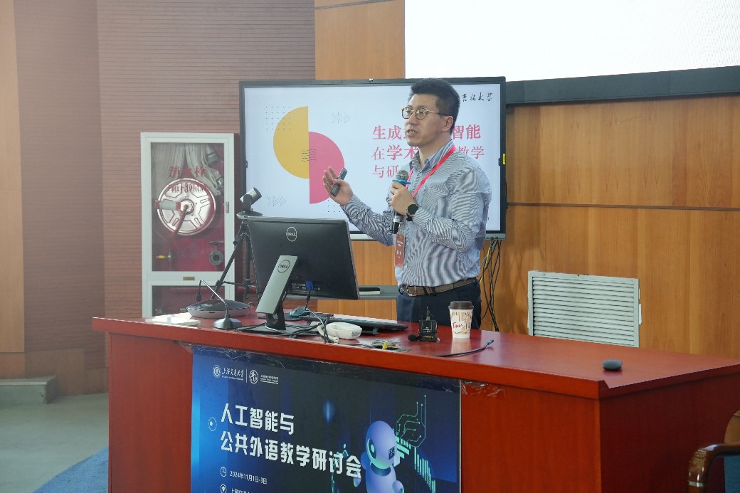吉林大学姜峰教授在题为“生成式人工智能在学术英语教学与研究中的应用”的主旨报告中,探讨了生成式AI如何帮助提升学术英语教学效果,包括提高学生写作能力和语篇意识,同时指出AI在学术伦理与批判性思维培养中的重要挑战。