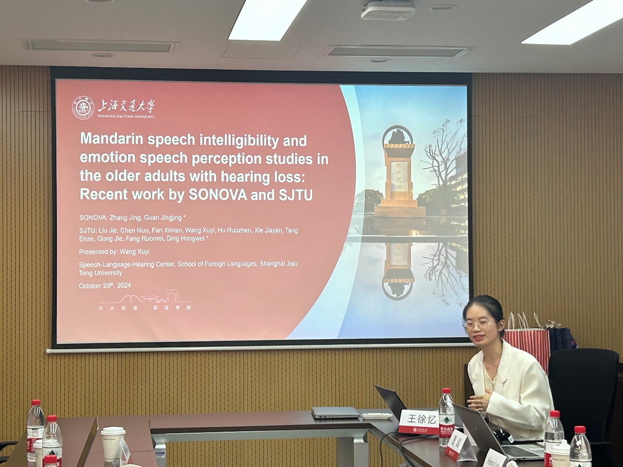 2024年10月29日,索诺瓦集团听力设备首席科学家Volker Kuehnel博士、大众汽车整车声学主管曹诚博士、索诺瓦集团数字信号处理首席科学家Henry Luo,索诺瓦集团中国区上海创新中心高级总监管晶晶博士、田欣、张笑天、黄瑄云、张静、张小龙等公司专家访问我院,我院丁红卫教授、汪玉霞副教授、林苡博士等言语-语言-听力中心研究团队师生出席,共同参加“环境中的言语听觉:声学基础及其应用”主题学术交流座谈会,分享各自团队的前沿研究成果。Volker Kuehnel博士、曹诚博士作专家主题发言,我院硕士生王徐忆作为学生代表作主题报告,展示和汇报了我院言语-语言-听力中心研究团队与索诺瓦公司合作研究的最新进展。各位专家学者共同探讨了言语与听觉研究和降噪助听技术研究的最新议题及发展趋势。会谈由丁红卫教授和高级总监管晶晶博士共同主持。