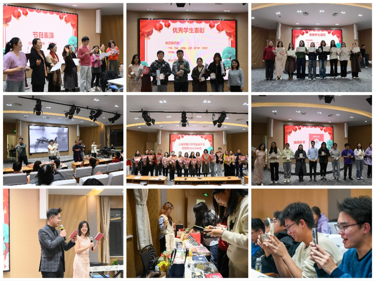 表彰结束后,精彩纷呈的节目表演与特色趣味的互动游戏将欢快的氛围推向高潮。来自日语系各个年级的同学们尽心呈现,歌曲悠远嘹亮、舞蹈饱含活力、琴声跃动昂扬,展现出学生们的才华与生气。教师合唱《未来へ》,用优美的歌声为同学们送上真挚的祝福与美好的期望;快闪节目太极拳表演以流畅的技法和生动的演绎展现出太极的形与意,让在场师生在惊喜之上更感受到传统武术的魅力。穿插在表演中的互动游戏趣味横生,富有日语特色,日本文化知识竞答考验师生专业素养,川柳创作激发全场创意与灵感,精巧绝妙的即兴作品引得掌声不断,方言传声筒让同学们在欢声笑语中感受广阔中国,日语词语接龙紧张刺激,选手们步步为营、自信应战。节目接近尾声,来到了交换礼物的环节,同学们互相领取彼此准备的礼物与贺卡,共同接收来自新年的诚挚心意与美好祝愿。