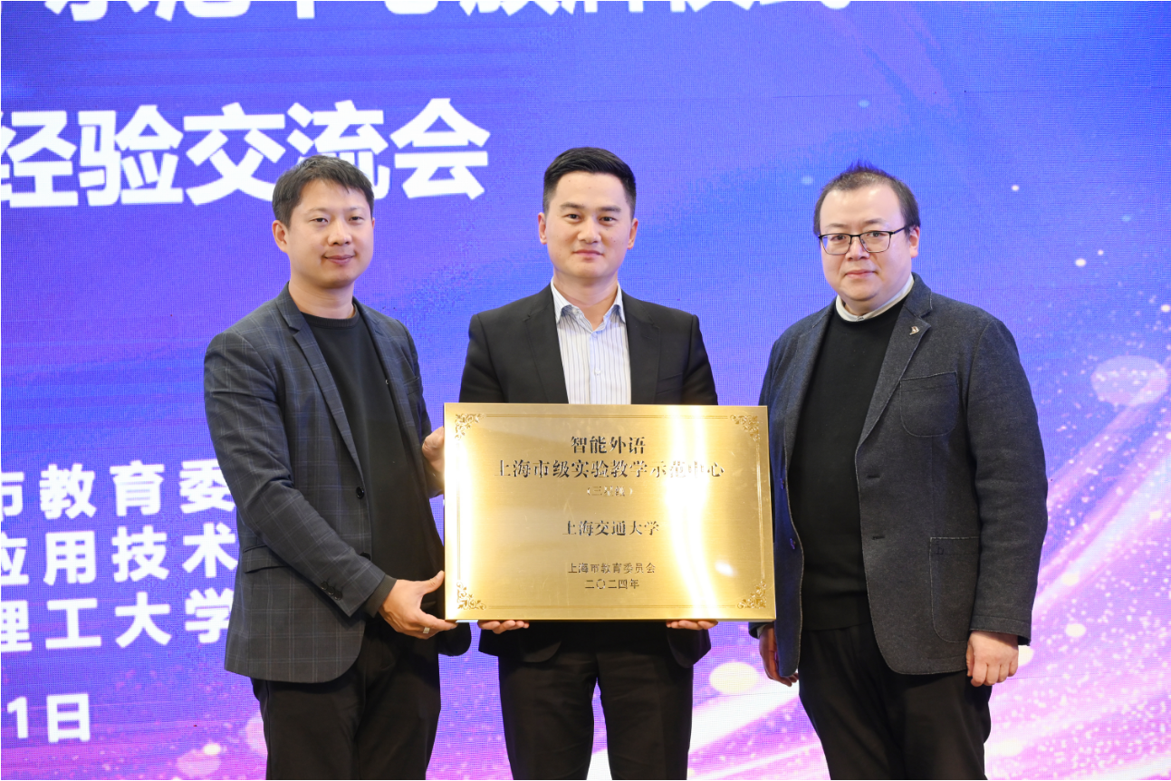 1月11日上午,2025年上海市级实验教学示范中心颁牌仪式暨示范中心建设经验交流会在上海应用技术大学举行。中心主任郇昌鹏教授代表上海交通大学开元网页版智能外语实验教学中心参加会议并接受颁牌。