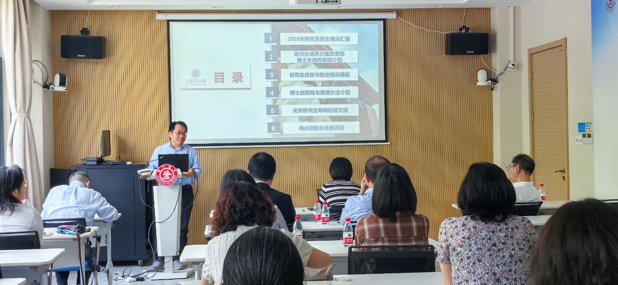 研究生教科办张轶恒汇报2025年学院研究生招生情况。2025年学院硕博研究生招生人数均实现新突破,生源质量持续提升,未来学院将在直博生招生、研究生招生类别和规模上推出新举措。