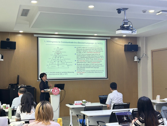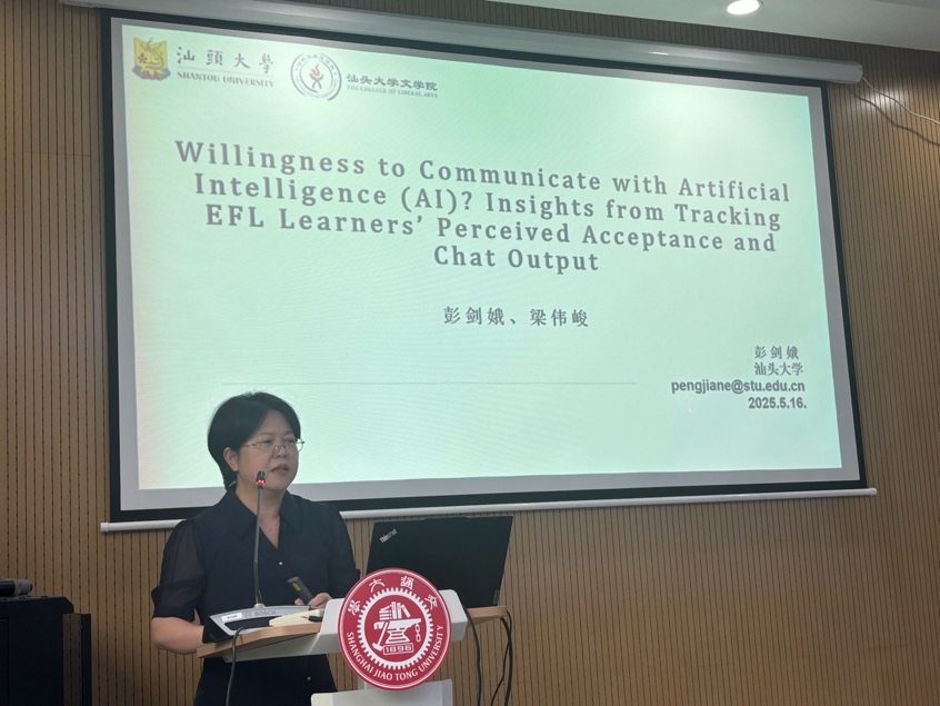 彭剑娥教授以《Willingness to communicate with artificial intelligence (AI) – Insights from tracking EFL learners’ perceived acceptance and chat output》为题,分享了其团队的最新研究成果。基于后人类主义视角和技术接受模型,彭教授团队对澳门地区12名英语学习者与ChatGPT的十周互动进行了追踪研究,探讨了学习者与AI交际意愿及其接受度之间的关系,包括感知易用性、感知有用性和使用态度等维度。彭教授指出,该研究为“与AI的交际意愿”这一前沿概念提供了全新视角,并揭示了交际意愿与AI接受度之间的动态关联,为未来相关研究提供了重要依据。