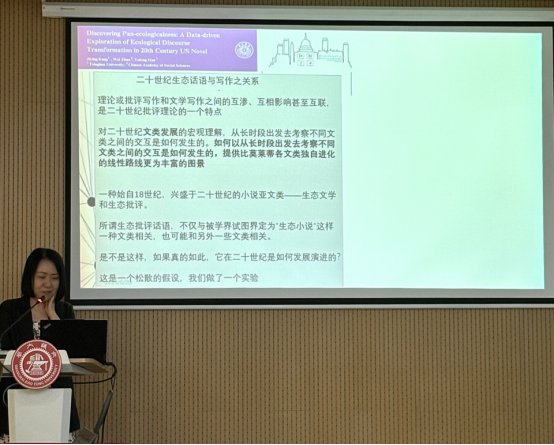 在讲座第一部分,赵薇详细介绍了中国社会科学院文学研究所数字人文与计算批评实验室的整体布局与发展规划。她指出,以正在向数字人文研究室转型的数字信息室为依托,实验室正在探索一种融合了数据分析、文学建模与细读批评的新路径:一方面让数字人文在文学研究中真正落地,促进实践共同体和相应标准的形成;另一方面,搭建起可共享的技术基础设施和跨学科合作网络。其最终旨归是要以自身为方法,推广平等、公正、透明的数字人文生产模式与生态。她特别强调,在人工智能时代背景下,计算批评的核心价值在于让人文学者在亲手创造模型和工具的过程中实现对世界的体认、推进对问题的理解,在思辨中认识“认识”的过程。应该从斯坦福文学实验室和芝加哥大学文本光学实验室的实践中吸取经验、教训,数字工具的使用应始终伴随对“工具性”自身的反思,在她看来,真正具有合法性与合理性的数字人文研究,应在“数据—模型—理论”的递归机制中嵌入细读检验环节,强化人类主体的高度参与。随后,赵薇以“二十世纪生态话语与写作关系”和“现代汉诗节奏理论的重构”为样例,生动展示了计算批评在文学研究中的应用,充分体现了该路径的可行性与批评深度。