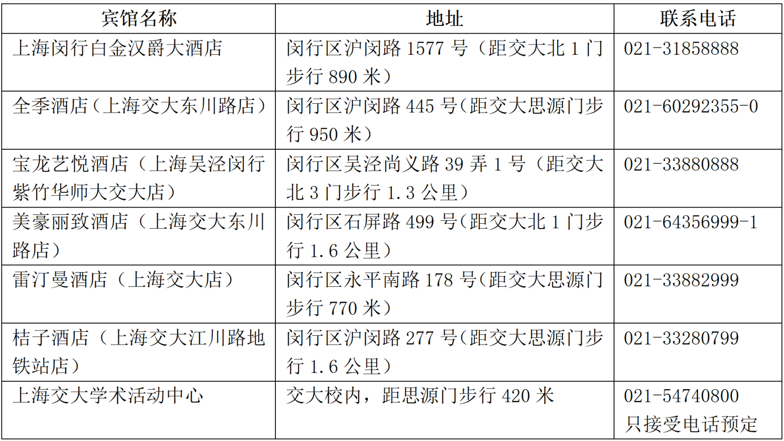 为方便与会学者自行预定会议期间住宿,以下为上海交通大学闵行校区周边部分宾馆信息,仅供参考。以下宾馆单人间与标间参考价均在300-450元/间/晚左右,具体价格根据订房时间有所浮动。详询宾馆或商旅平台。