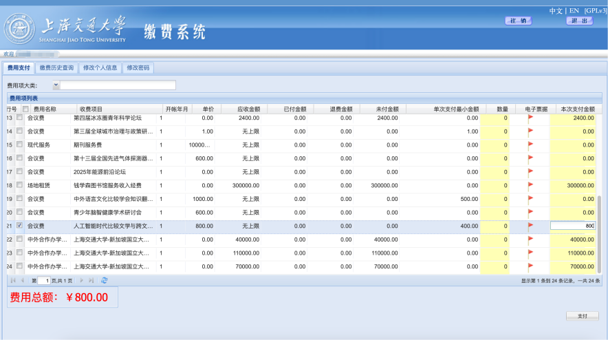 1) 进入支付页面后,教师统一输入 800 元、学生统一输入400元进行支付;