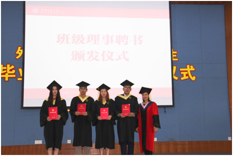 On the morning of July 5th, the SFL Undergraduate Commencement Class of 2019 was held in Room 200, Yifu Building. Attendees of the ceremony included Dean Hu Kaibao, Party Secretary Ding Jian, Deputy Party Secretary Zhang Hongmei, Associate Dean Tao Qing, degree-awarding teachers including Shang Biwu, Zhu Yifan, Wang Lin and Li Fei, teacher representatives from all departments, as well as the graduating class of 2019 and their parents. The ceremony was chaired by Tao Qing.