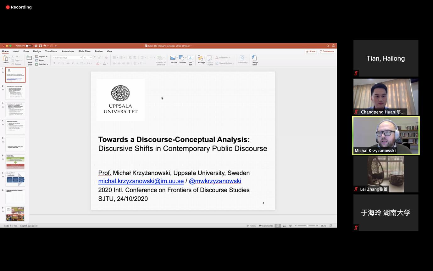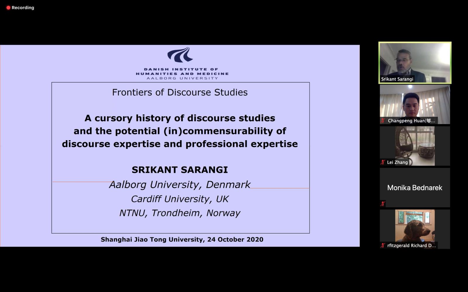 The 2020 International Conference on Frontiers of Discourse Studies was held on 24 October 2020 via Zoom and live-streamed on Bilibili. The conference was hosted by School of Foreign Languages, SJTU, and attracted more than 4,000 viewers on Bilibili and another 200 in the Zoom conference room. The conference invited four editors of internationally renowned (also SSCI-indexed) journals in discourse studies, as well as two leading Chinese scholars. It is believed that the conference provided new insights into understanding the frontiers of the field.