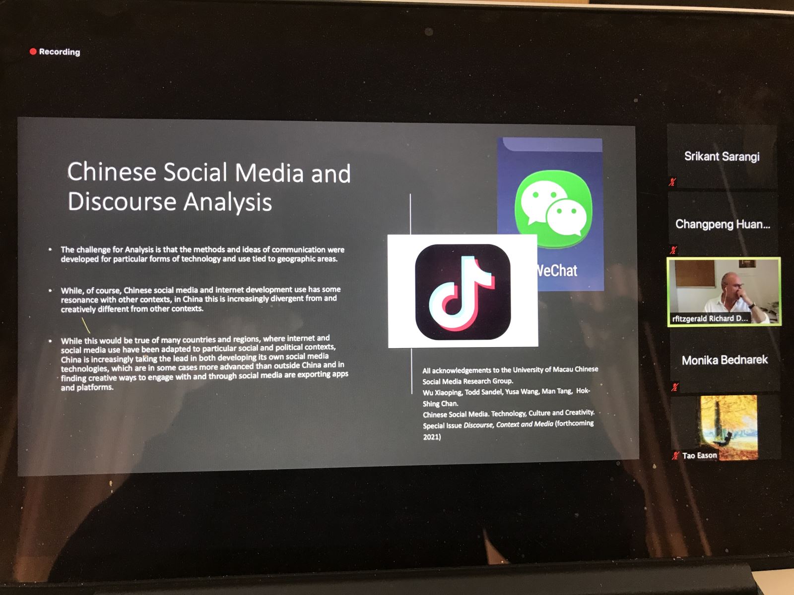 Professor Richard Fitzgerald, editor of Discourse, Context & Media, focused on “challenges and opportunities for discourse analysis”. He raised these questions before presenting some research on Chinese social media as a way to remind ourselves as discourse analysts and translation scholars that the phenomena should always be at the center of any analysis and that the methods of analysis should be emergent from the phenomena.