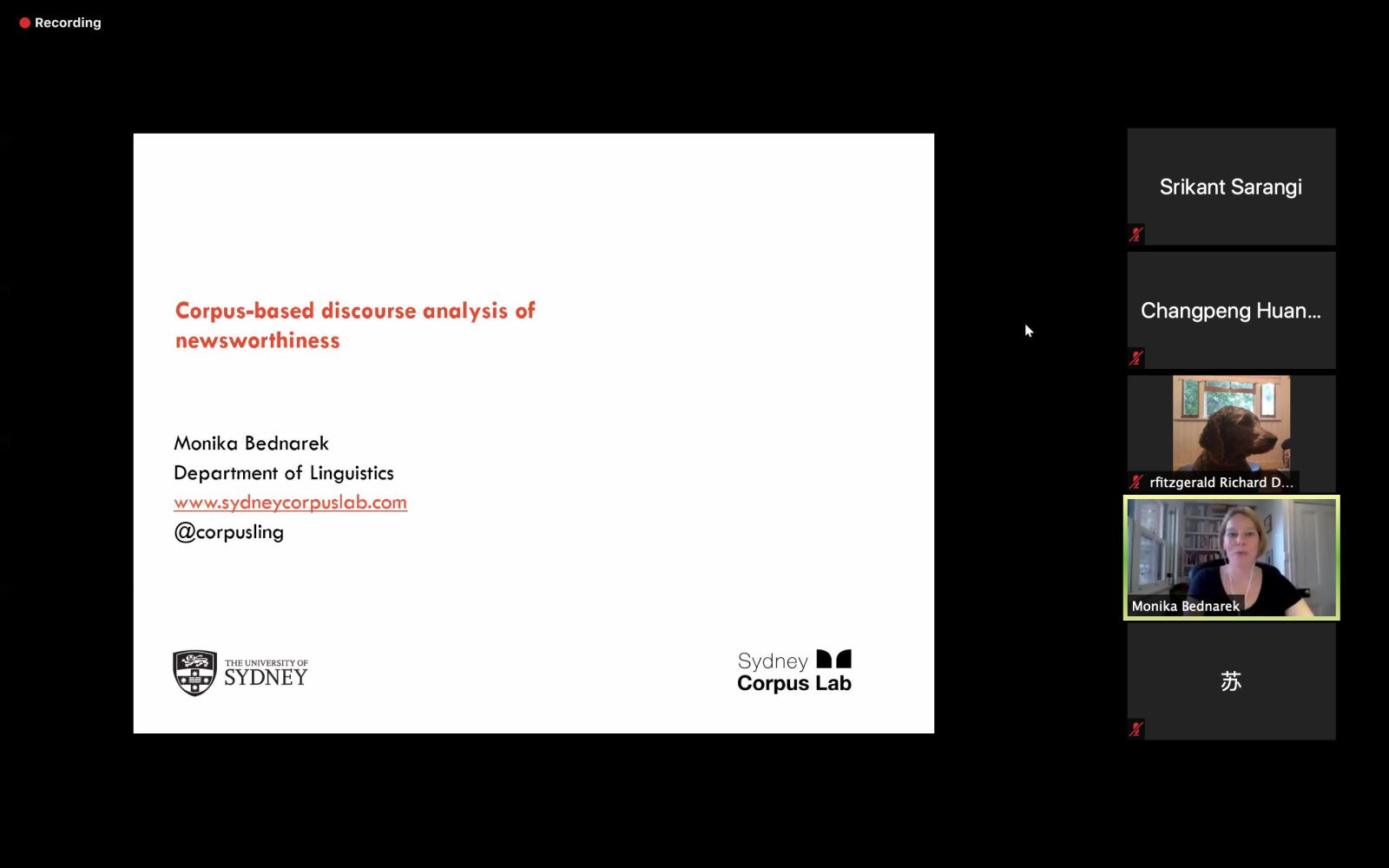 A/ Professor Monika Bednarek, co-editor of Functions of Language, talked about “corpus-based discourse analysis of newsworthiness”. In her talk, she provided an introduction to DNVA, focusing in particular on some of the challenges faced when undertaking linguistic analysis of newsworthiness. She also touched upon the lessons learned from case studies using corpus-based discourse analysis, and briefly discussed issues that arise when undertaking cross-linguistic/cross-cultural DNVA research .
