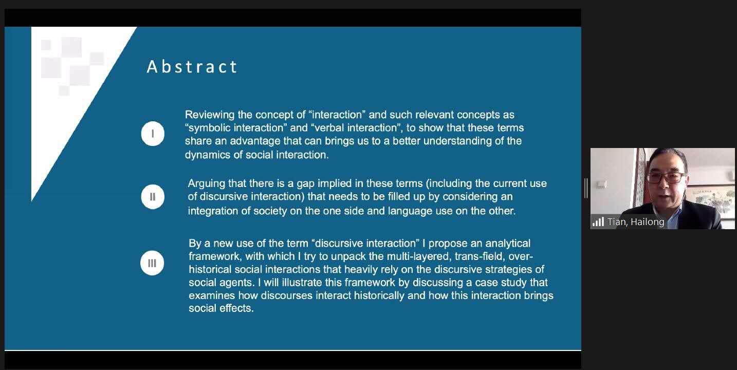 Professor Tian Hailong, Editor-in-Chief of Discourse Studies Forum, proposed a new term “discursive interaction” and an analytical framework to unpack the multi-layered, trans-field, over-historical interactions that heavily rely on the discursive strategies of social agents. He illustrated this framework by discussing a case study that examined how discourses interact historically and how this interaction brings social effects.