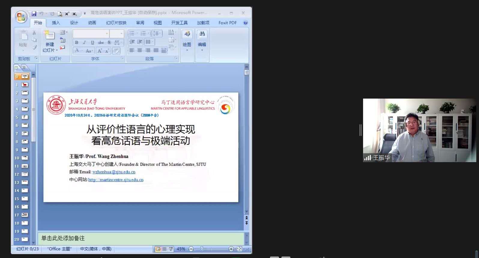 Professor Chang Hui, acting dean of School of Foreign Languages, SJTU, gave an opening speech by warmly welcoming the audience online. He expressed sincere thanks to the invited plenary speakers for their participation regardless of huge time difference.