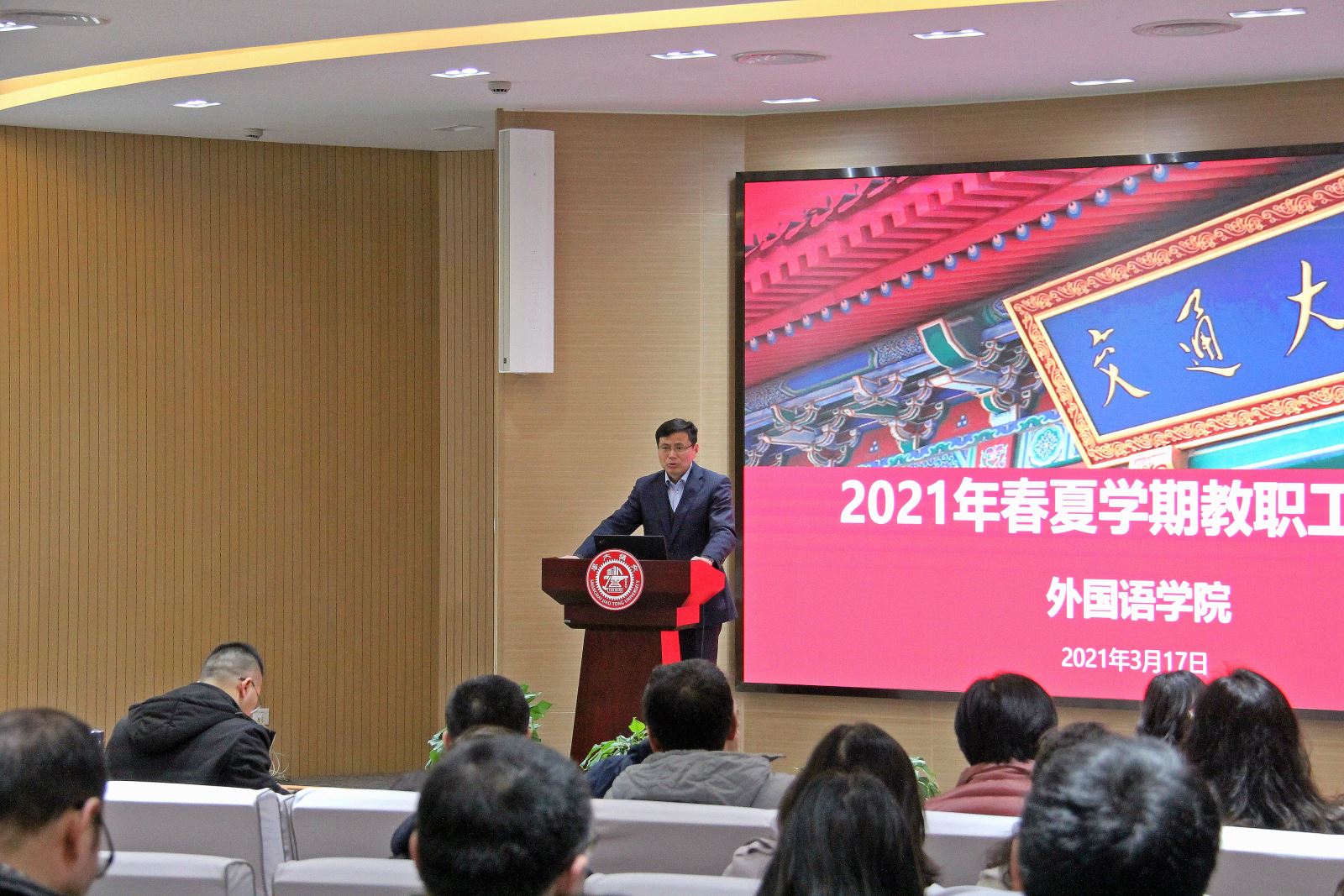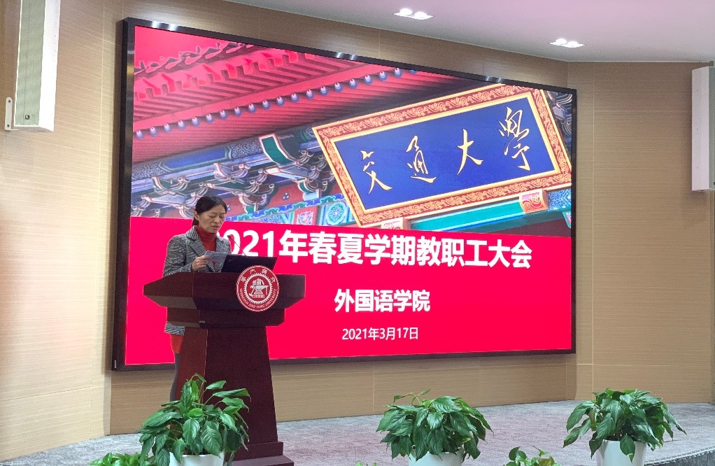 On the afternoon of March 17th, the faculty meeting of the School of Foreign Languages (hereafter referred to as SFL) was held, with the leaders of SFL and all the faculty and staff attending the event. The meeting was presided over by Xing Lianqing, Vice Secretary of CPC SFL Committee.