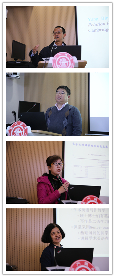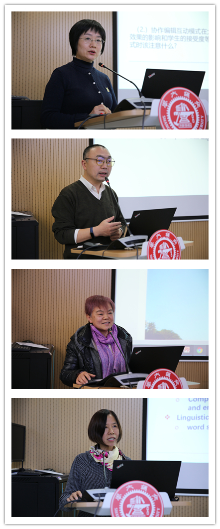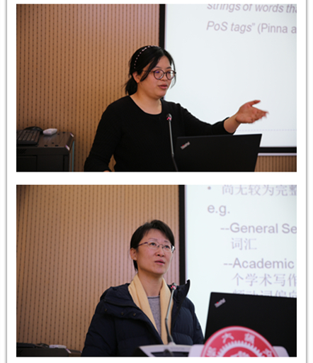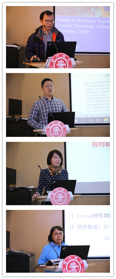 The first presentation of the Center came from Professor Shiyu Wu. Professor Wu discussed the bottleneck problems in English learning by Chinese English as a Foreign Language (EFL) learners across different proficiency levels. Associate Professor Fengchao Zhen's presentation was entitled “New Approaches to Corpus-Based Literary Research: Meaning Construction of Textual Object of "Hailsham" in "Never Let Me Go”.  Ms. Yu Yang's presentation was entitled “A Questionnaire-Based Study of Chinese Japanese Learners' Acquisition of Corresponding Intransitive and Transitive Verbs Pairs". Associate Professor Lu Yuanwen's presentation was entitled "A Study on Peer Review Application Based on CANVAS Platform - A Case Study of College English Teaching". Associate Professor Chunyan Wang's presentation was entitled "A Study on the Teaching Model of 'Real-time Collaborative Online Text Editing' in College English Classroom". Prof. Lei Lei's presentation was entitled "Syntactic Complexity In Adapted Extracurricular Reading Materials". Prof. Yan Tian's presentation was entitled "A Complex Dynamic System Approach to Predict Learners' Online Translation Learning Behavior". Prof. Hongwei Ding's presentation was entitled "Speech Prosody in Mental Disorders". Prof. Bingjun Yang presented on "From Aristotle's Metaphor Theory to Halliday's Grammatical Metaphor". Associate Professor Xu Zheng's presentation was entitled “Chinese Morphology Revisited: A Perspective Based On Bloomfield's Original Definition of Morphology”. Associate Professor Cao Hui's presentation was entitled "Exploring on Ideological Work Strengthening and Political Awareness Raising in Foreign Language Courses Based on Students' Needs - A Discussion on the Application of Corpus to French Teaching". Associate Professor Lei Xiuyun's presentation was entitled "An Exploration of the Causes of Chinese Students' Deficiencies in English Writing Logic - An Introduction". Ms. Lin Ling's presentation was entitled "A Study of Lexical Sequences in Academic Texts". Ms. Zhao Hongyan presented "Notional Verbs in Academic Texts: A Corpus-Driven Study of Learners' Usage".
