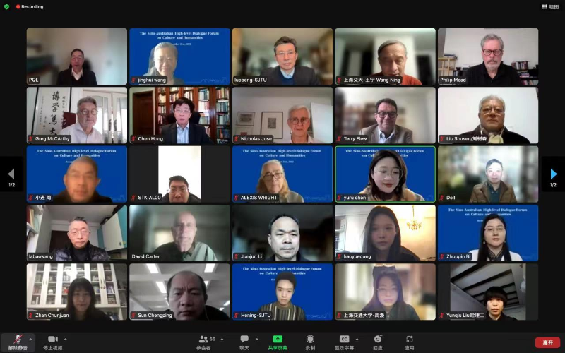 To celebrate the 50th anniversary of the establishment of diplomatic relations between China and Australia, Centre for Australian Studies at Shanghai Jiao Tong University and Centre for Australian Studies at Tsinghua University co-organized the Sino-Australian High-level Dialogue Forum on Culture and Humanities on Dec. 21st, 2022. The conference was held online between renowned scholars from many institutions and universities in China and Australia, including Shanghai Jiao Tong University, Tsinghua University, Peking University, Renmin University of China, East China Normal University, Beijing Foreign Studies University, Shanghai Foreign Studies University, University of Melbourne, University of Sydney, University of Adelaide, University of Western Australia, Monash University, etc., aiming to enhance academic exchanges and cross-cultural dialogues between Chinese and Australian humanities scholars, to deepen and extend bilateral cooperation in multiple dimensions such as teaching and research, social exchange and mutual cultural appreciation, and to explore the common values pursued and practiced by China and Australia from the humanistic, social and cutting-edge perspectives.