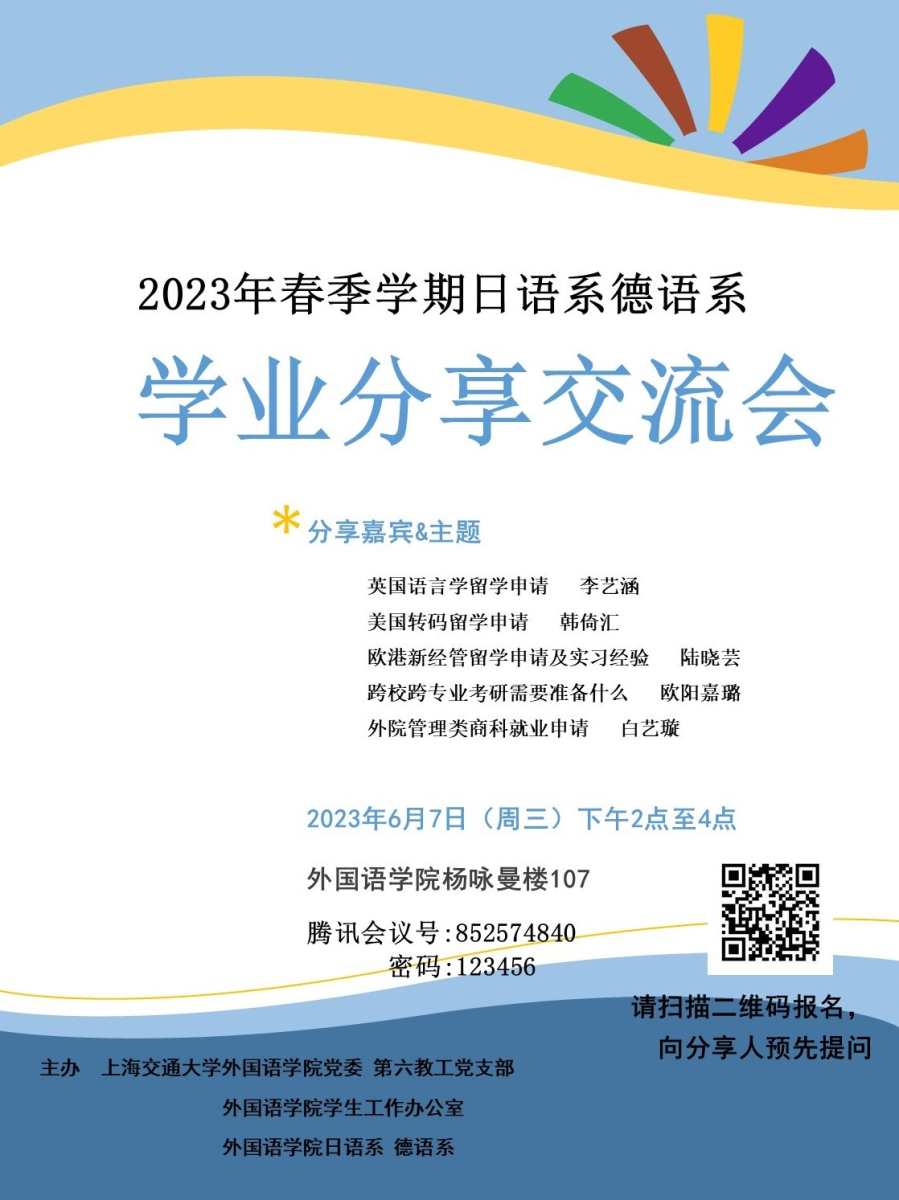 On the afternoon of June 7, 2023, the Sixth Party Branch of the Party Committee of the School of Foreign Languages, the Student Affairs Office, the Japanese Department and the German Department jointly held the 2023 Autumn Semester Academic Planning and Sharing Meeting. Five undergraduate students from Grade 2019 of the Japanese Department and the German Department shared their experiences in applyinging for studying abroad, taking the postgraduate entrance examination, internships, job hunting and employment. The meeting took place in the Conference Room 107 of the Foreign Languages Building and was also shared online through Tencent Conference to facilitate communication.