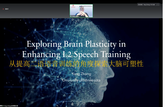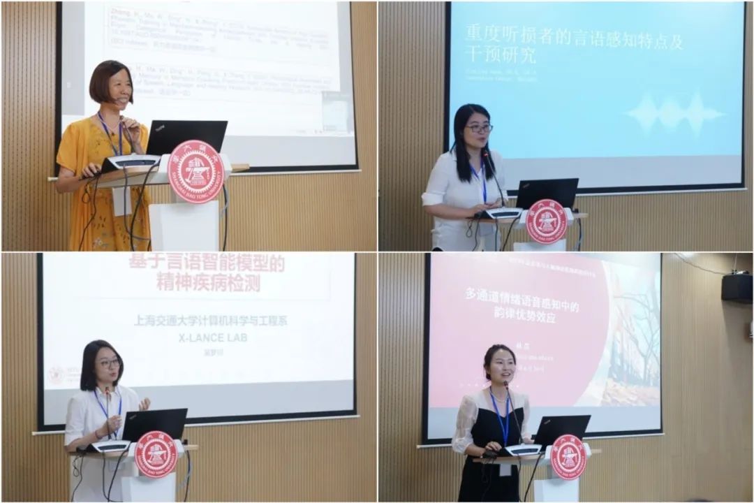 Afterward, Professor Zhang Yang, Professor Ding Hongwei, Dr. Guan Jingjing, Associate Researcher Wu Mengyue, and Dr. Lin Yi delivered keynote speeches respectively. Professor Zhang gave a keynote speech entitled "Exploring Brain Plasticity in Enhancing L2 Speech Training". Professor Ding Hongwei gave a keynote speech entitled "Interdisciplinary Research and Domestic and Foreign Cooperation on Phonetics in SFL, SJTU ". Dr. Guan Jingjing gave a keynote lecture entitled " Characteristics of Speech Perception and Intervention for People with Severe Hearing Loss". Associate researcher Wu Mengyue gave a keynote speech entitled "Mental Illness Detection Based on Voice Intelligence Models". Dr. Lin Yi gave a keynote presentation entitled "Prosodic Dominance Effects in Emotional Speech Perception: Evidence from Cross-Channel Effects".