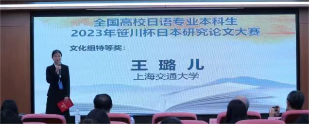 After going through rounds of selection by domestic and foreign experts, the winning paper stood out from 140 entries, made its way to the top ten of the culture group, and entered the final which involved on-site defence of two stages: PPT presentation and answering the judges' questions. Nearly 30 contestants from dozens of universities and colleges in China, including Renmin University of China, Zhejiang University and Beijing Foreign Studies University, participated in the final. With her fluent oral Japanese, solid research skills and excellent ability to play on the spot, Wang Luer snatched the grand prize of the culture group .