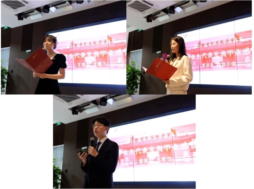 Mr. Zhen Fengchao from English Department, Mr. Lin Zibo from Japanese Department, and Mr. Xue Yuan from German Department reviewed the growth of the graduates in the past four years, and proposed to give applause to the people around them with the attitude of "Carpe Diem", and encouraged them to turn the love of the alma mater, the love of teachers and students, and the love of classmates into the source of motivation to blaze new trails in the future. They wished the graduates a fruitful and meaningful life .
