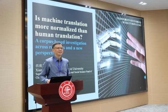 After the opening ceremony, the symposium entered the keynote report session, which arranged seven expert reports with rich contents and diverse themes. Professor Zhu Yifan of SJTU hosted the first and second keynote reports. The first presentation was given by Professor Hu Xianyao of SWU, entitled “Is machine translation more normalized than human translation? A corpus-based investigation across registers and a new perspective”. In his presentation, he explored whether the normalization hypothesis applies to machine translation, and by comparing the linguistic features of machine translation with those of human translation, he found that normalization is not a universal characteristic of machine translation, but rather human translation shows a stronger tendency to be conservative. This phenomenon may be related to socio-cognitive factors and influenced by stylistic differences.