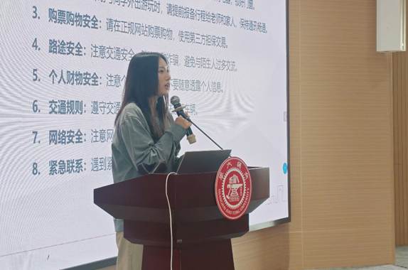 华佳就期末心理健康与假期安全做温馨提醒。她提醒同学们在紧张的复习备考期间,有情绪困扰和焦虑情绪可以及时联系学院、学校的帮助,保持身心健康。针对即将到来的假期,华佳特别强调了离校报备、旅途及财物安全等注意事项。